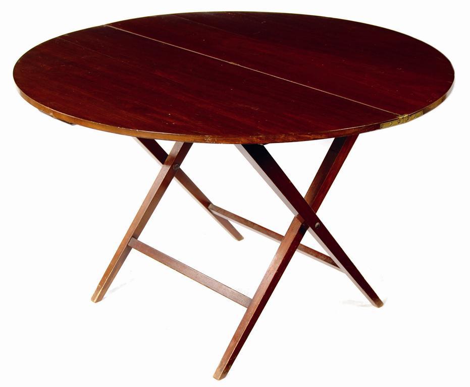 A beechwood folding coaching table by Thornton & Herne, with ivorene label 'Thornton & Herne, 18 Little Cadogan Place, Pont Street, S.W. Patent No: 311.116', 26in (66.2cm) h, 41.5in (105.6cm) d (open). Catch lacking.