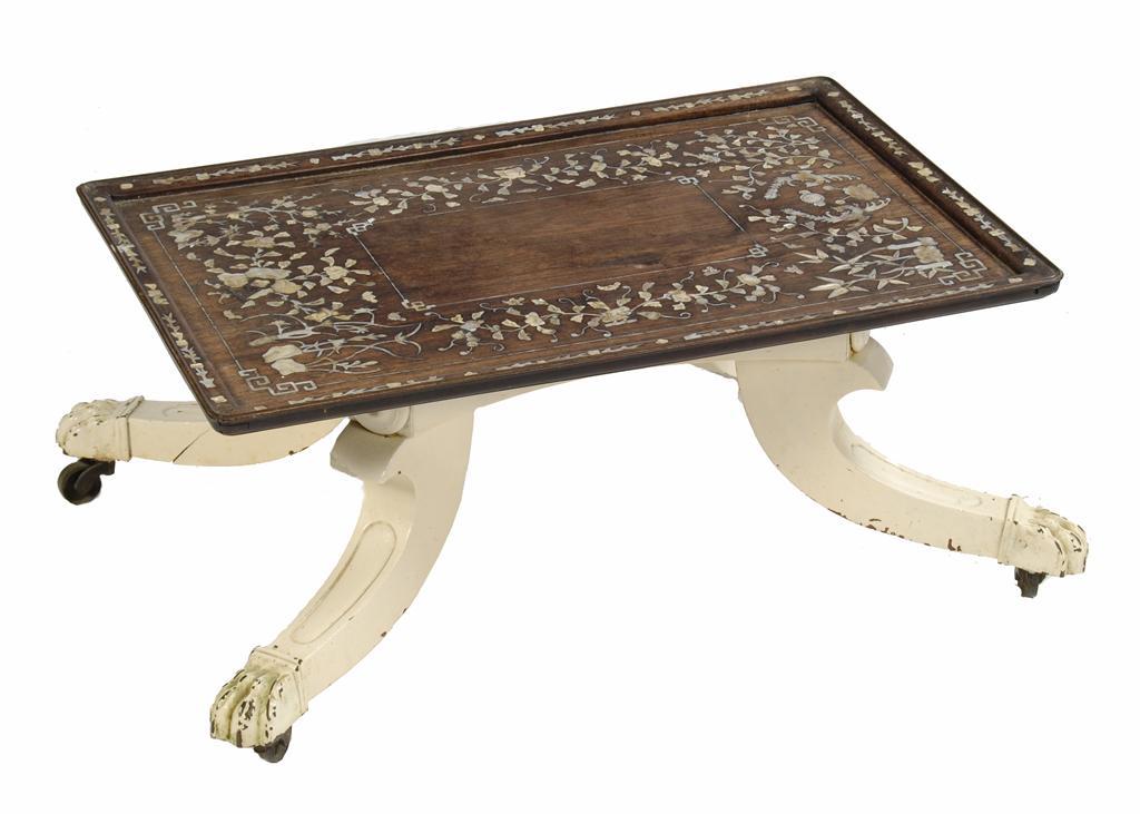 A Chinese rosewood and mother of pearl marquetry tray, 24.75 x 16.25in (63 x 41cm) on a white painted Regency table base, 10.5in (26.5cm) h.