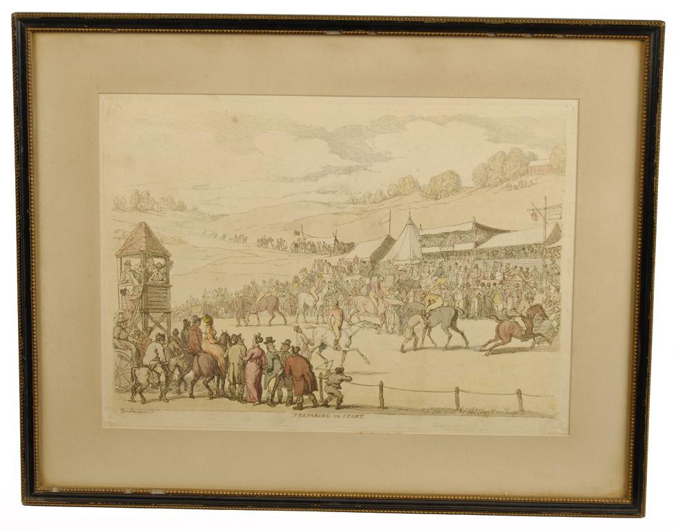 After Thomas Rowlandson. 'Preparing to Start', a coloured engraving, 10 x 14in (25.5 x 35.5cm) and a caricature after James Gillray, 'Integrity Retiring from Office'. (2)