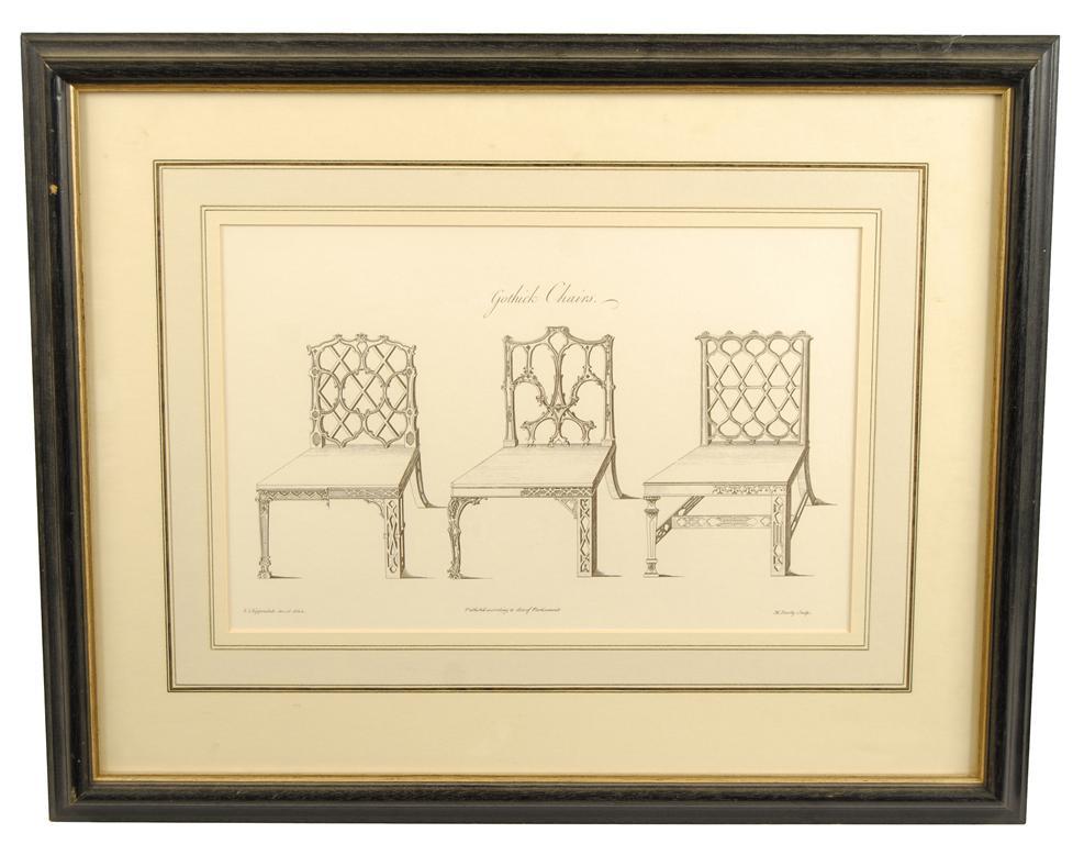 Two reproduction engravings after Thomas Chippendale, chair designs, 9.25 x 14in (23.5 x 35.5cm). (2)