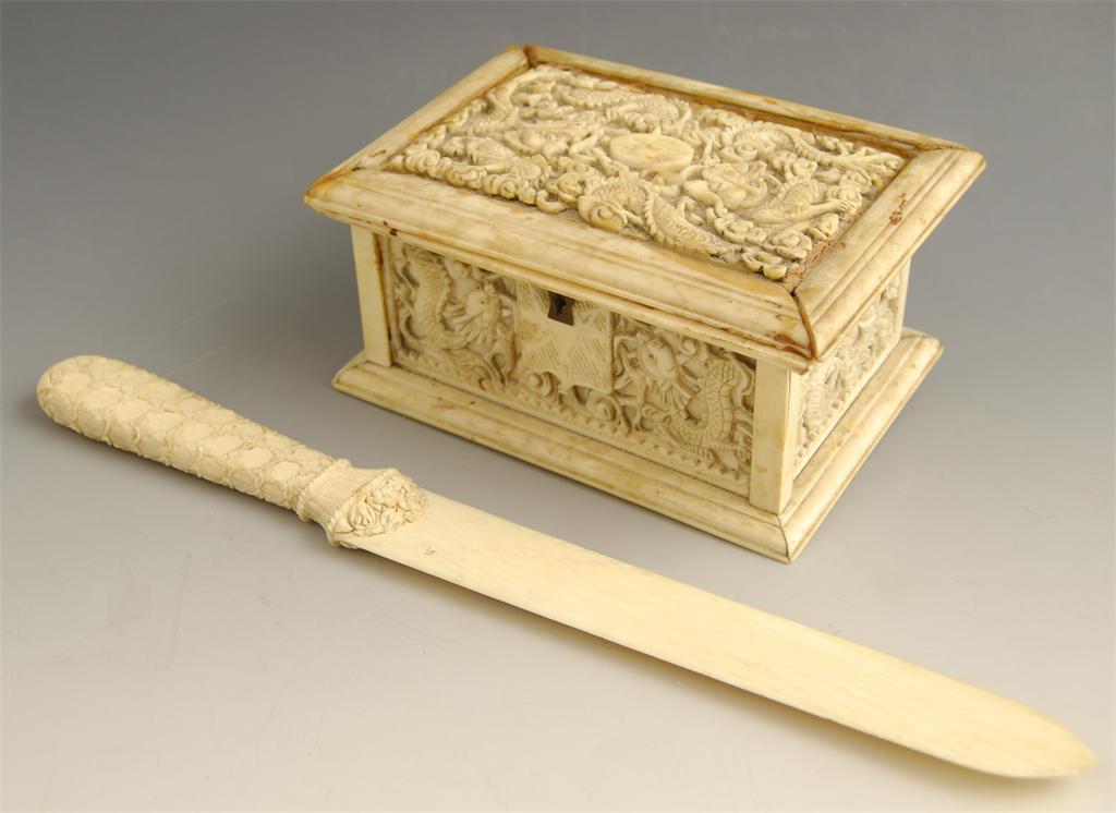 An oriental carved bone box, decorated dragons amidst clouds, the velvet lined interior with a lift-out tray, 2.5in (6cm) h, 5.5in (14cm) w, glue join repairs, and a French carved ivory paper knife, 10.75in (27.5cm) l. (2)