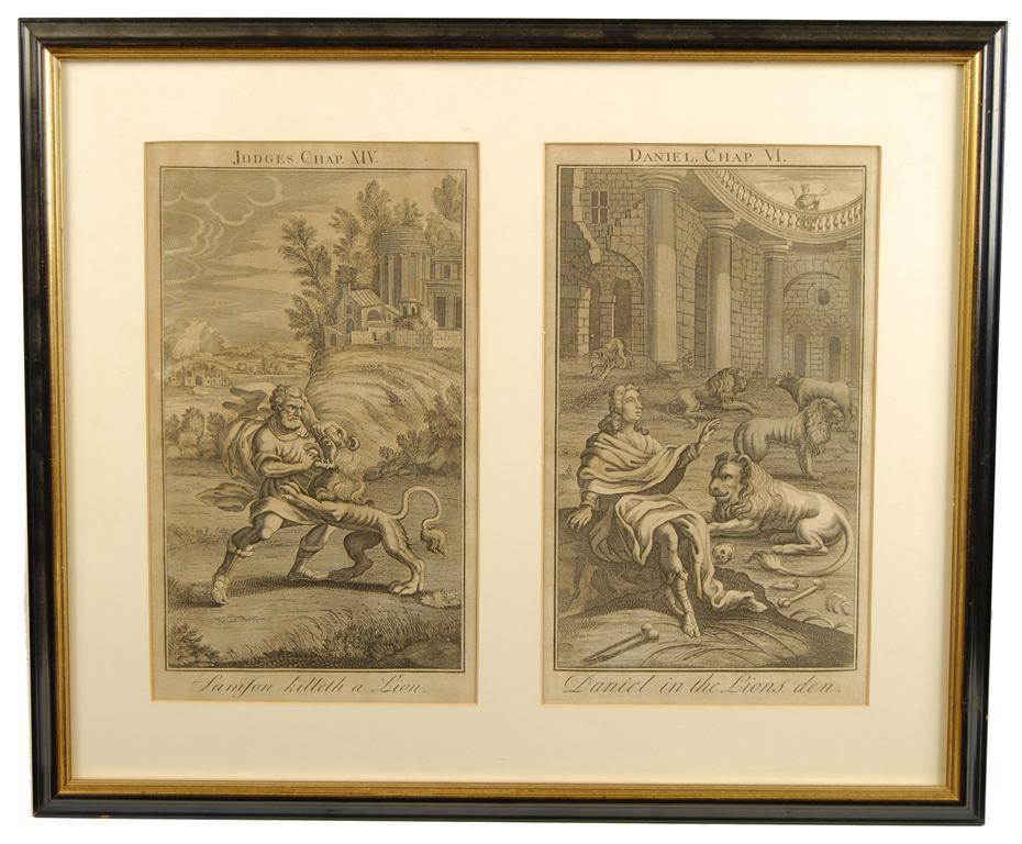 Four Biblical engravings, including 'Sampson Killeth a Lion', mounted in two frames and a classical engraving. (5)