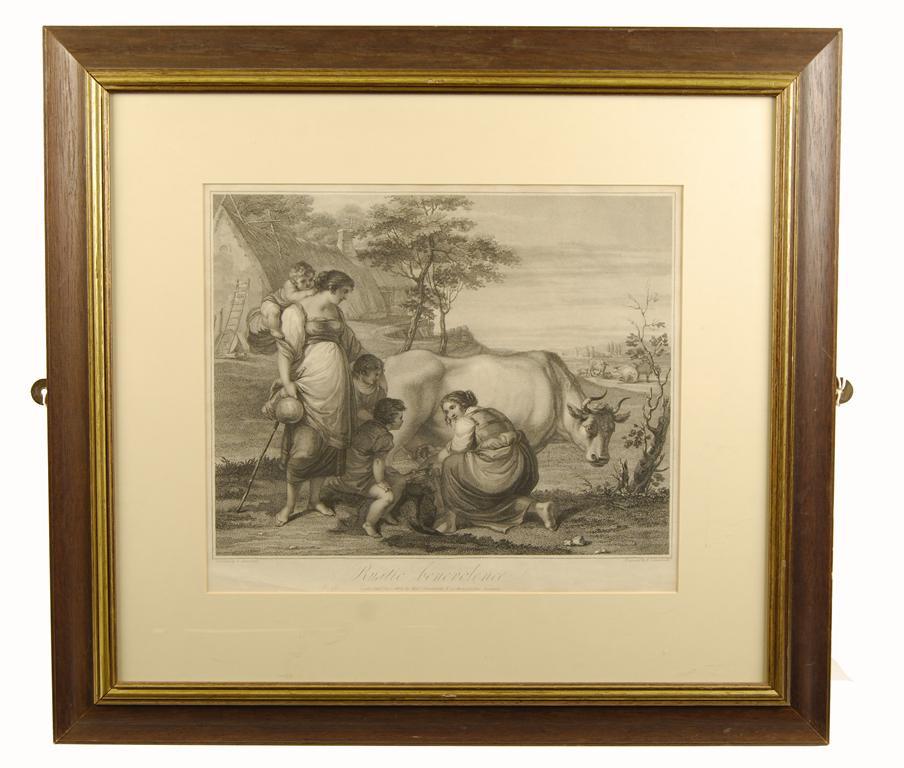 After F. Zuccarelli, 'Rustic benevolence', an engraving by N. Schiavonetti, 15 x 17.25in (38 x 44cm).