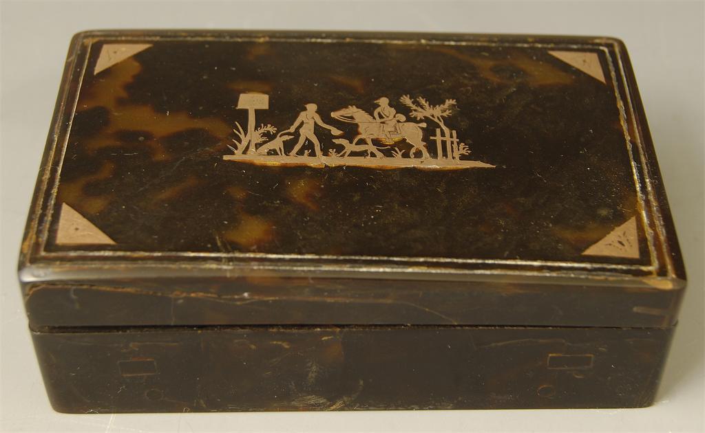 A 19th century continental tortoiseshell and pique box, the cover with a hunting scene, 3.75in (9.5cn) w. Repairs, previously with musical movement.