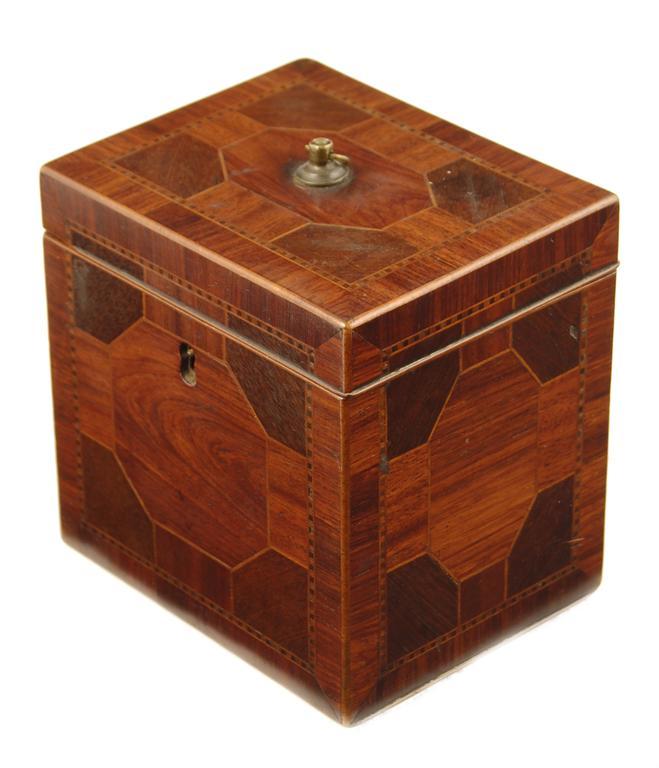 A George III mahogany, kingwood and rosewood tea caddy, with parquetry panels and a replaced brass handle, the interior lead lined, 5in (15cm) h and w, 4in (10cm) d. Crack to the back of the lid above the left hinge.