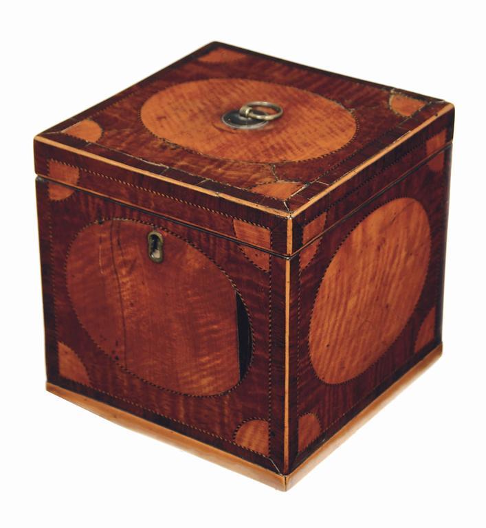 A George III mahogany and satinwood cube shaped tea caddy