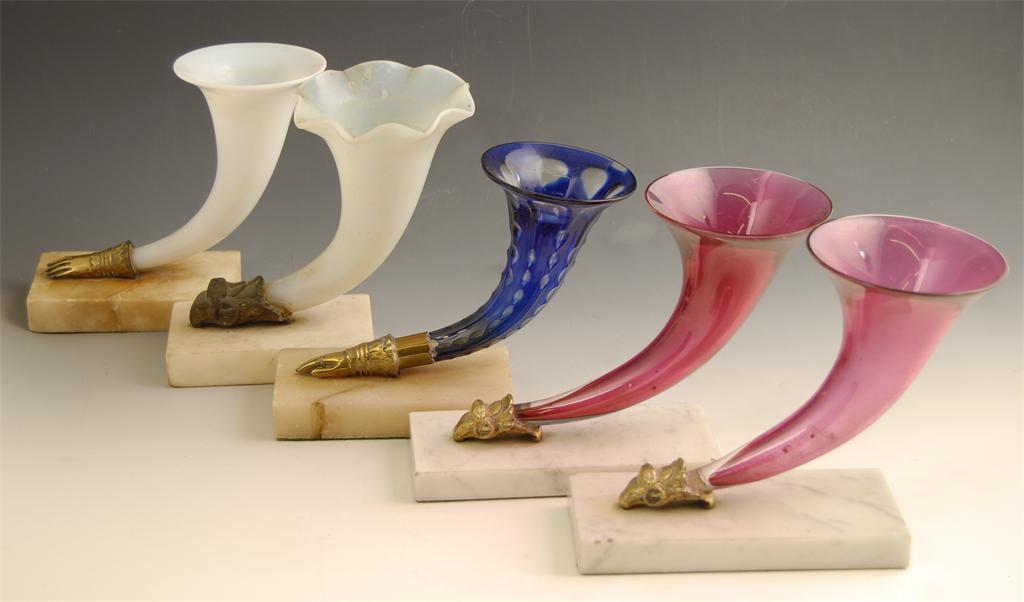 A pair of ruby glass cornucopia vases, with ormolu rams head terminals and white marble bases, 6.5in (16.5cm) h, and three other cornucopia vases, one with a rams head terminal and two with gauntlets. (5)