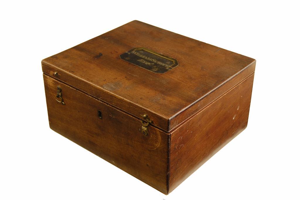 A mahogany silver box, the hinged lid with a brass campaign style handle inscribed 'William Scrope ESQR', to a part velvet lined interior with a circular paper label for 'Rundell, Bridge And Rundell', originally with a tray, with paper label 'Defert Spoons', 5in (12.8cm) h, 10in (25.5cm) w, 8.75in (21.8cm) d. Paper label spotted, lacking lock. ¦William Scrope (1772-1852) was an artist and sportsman. He was a direct descendent of the first Baron Scrope of Bolton, lord treasurer to King Edward III. William inherited the family property at Castle Coombe, Wiltshire in 1787.