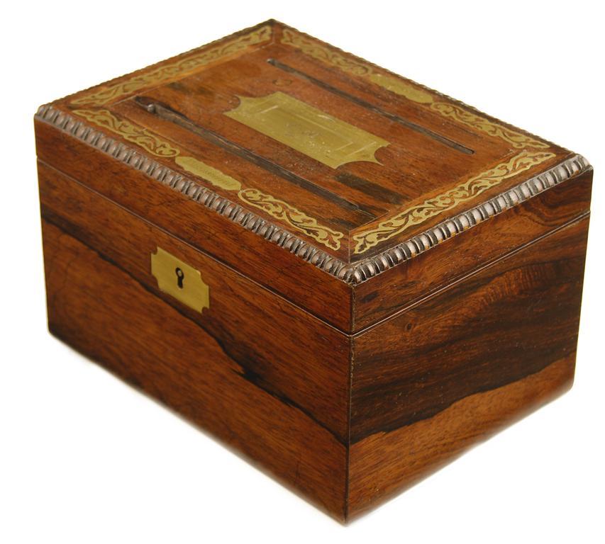 An early Victorian rosewood and brass marquetry letter box, the hinged cover with an inset brass handle, inscribed 'E.M', with two pierced slits for 'Answered' and 'Unanswered', to a reel moulded edge and a paper lined divided interior, 5in (12.5cm) h, 8.25in (21cm) w, 6.25in (16cm) d.