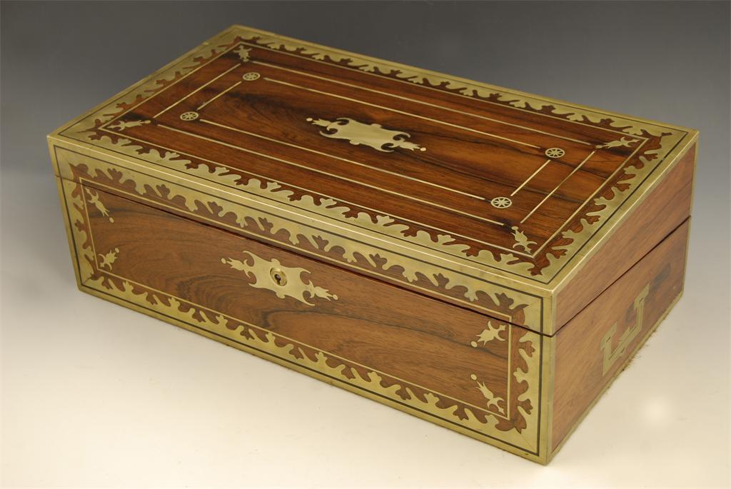 A George IV rosewood and cut brass writing slope, the hinged lid inset a vacant plaque to a maroon and gilt tooled leather inset writing surface, with twin inkwells, pen rest and lidded compartment above three secret drawers, the lock stamped 'GR crowned, PATENT', with sunken side carrying handles, 6in (15cm) h, 18in (45.5cm) w, 10in (25.2cm) d. With key, restored.