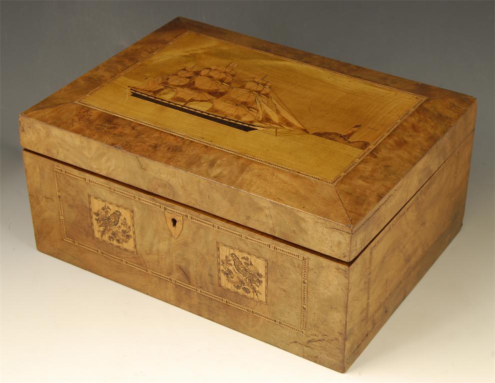 A Victorian walnut and Tunbridge ware box, the hinged lid inlaid a three masted sailing ship with a lighthouse beyond, to a compartmented interior, three with lids, one with a paper label with a handwritten inscription 'Made by B. Stone aboard the Nore light ship Sheerness, Kent, Sept 1877', 6in (14.8cm) h, 13in (33cm) w, 9.75in (24.6cm) d.