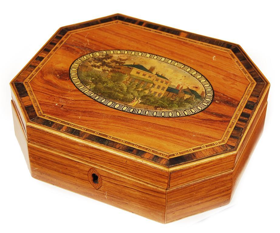 A kingwood and rosewood banded octagonal box, the cover with an oval coloured print of Sir William Curtis's house, Ramsgate, 2.25in (5.5cm) h, 7in (18cm) w, 6in (15cm) d. The top with a small crack and lid slightly warped.