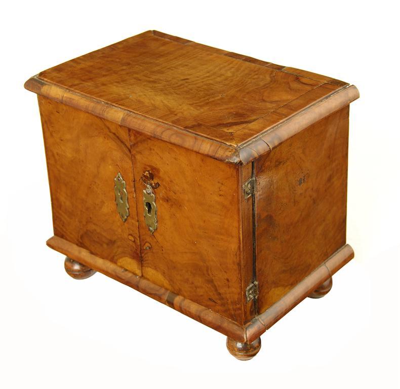 An early 18th century walnut table cabinet, with a cross banded moulded edge top above a pair of doors, the insides with marquetry pewter panel with crimped borders and an arrangement of six conforming front drawers, on replaced turned feet, 7.25in (18.5cm) h, 8.25in (21cm) w. Restoration, previously with side handles.