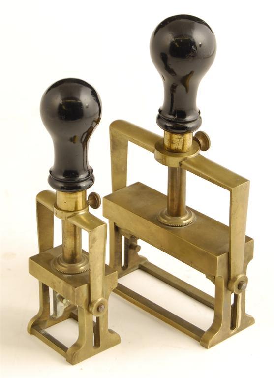 A brass and ebonised handled desk stamp, 8in (20.5cm) h, 4.75in (12cm) w, and another smaller. (2)