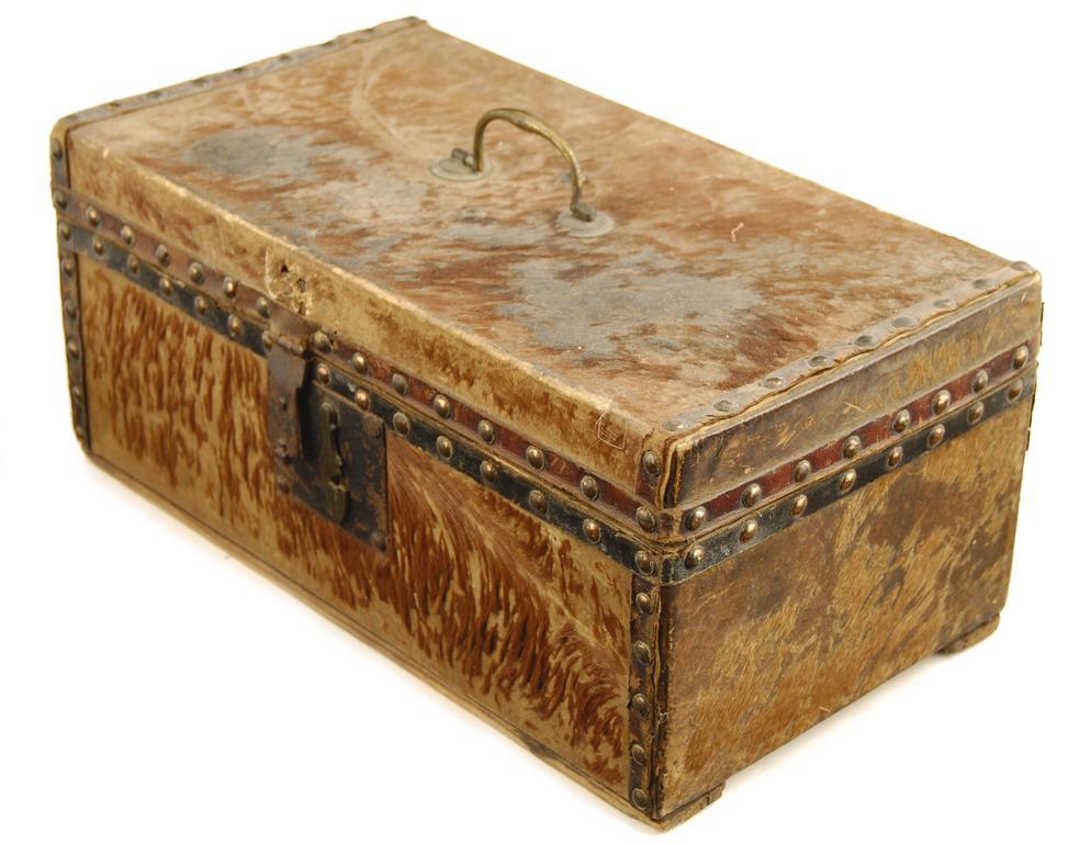 A 19th century hide covered and brass studded small trunk, with a hinged cover having a brass handle, the paper lined interior with a printed label for 'J.WOODMAN TRAVELLING Trunk and Portmanteau Manufacturer, 21 HIGH STREET, EXETER, 6.25in (16cm) h, 14in (35.5cm) w, 7.5in (19cm) d.