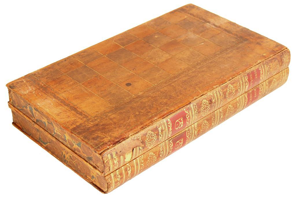 A leather bound games box, in the form of two volumes of 'The History of England', with chequer board exterior and backgammon interior, 17.5in (44.5cm) w.