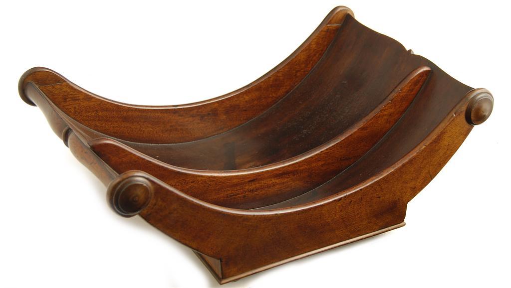 An early 19th century mahogany cheese coaster, with applied rondels and split baluster lifts, on brass roller castors, 6.25in (16cm) h, 17in (43cm) w, 11in (28cm) d. Patch repair under one lift, cracks.