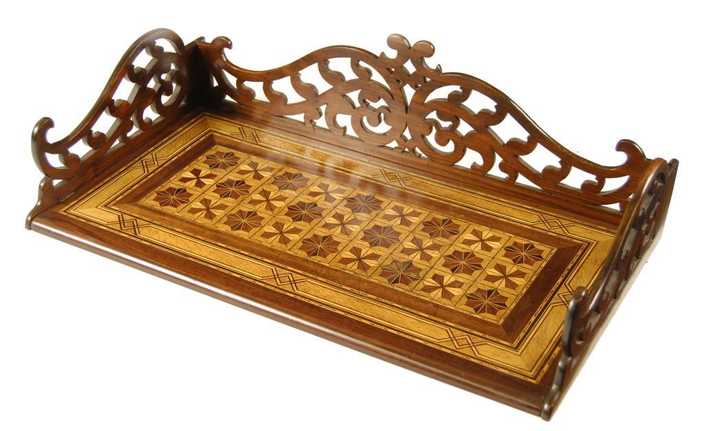 A Victorian rosewood and parquetry folding bookstand, with a pierced gallery, 6in (15cm) h, 20.75in (52.6cm) w, 11.25in (28.5cm) d.