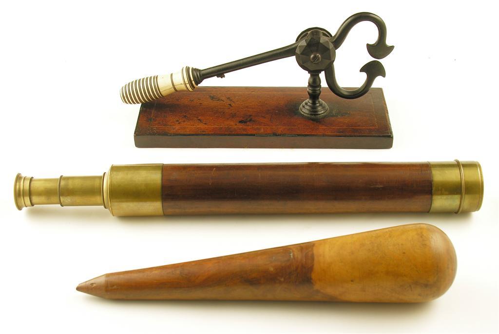 An early 19th century wrought iron sugar cutter, with a turned bone handle on a mahogany base with stringing, 11.5in (29cm) l, a turned lignum vitae fid, stamped W.Clements & Son and arrow, 12in (30.5cm) l, and a brass and mahogany bound two draw telescope. (3)