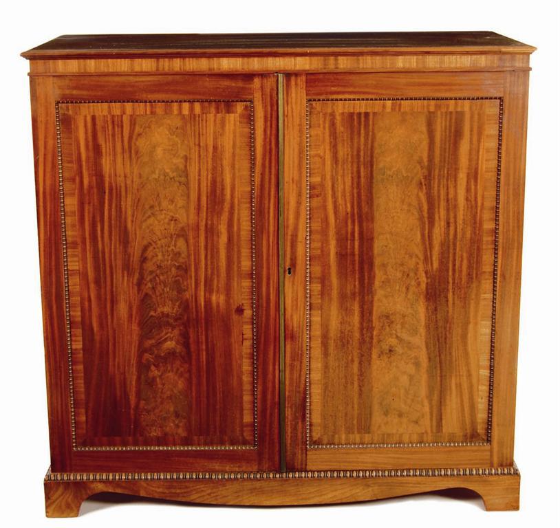 A George IV mahogany low linen press, the moulded edge top above a pair of crossbanded panelled doors with nulled mouldings enclosing five mahogany shelves, on bracket feet, 48.25in (122.5cm) h, 49.5in (125.5cm) w, 23.5in (59.8cm) d. Restoration and replacements, lock replaced.