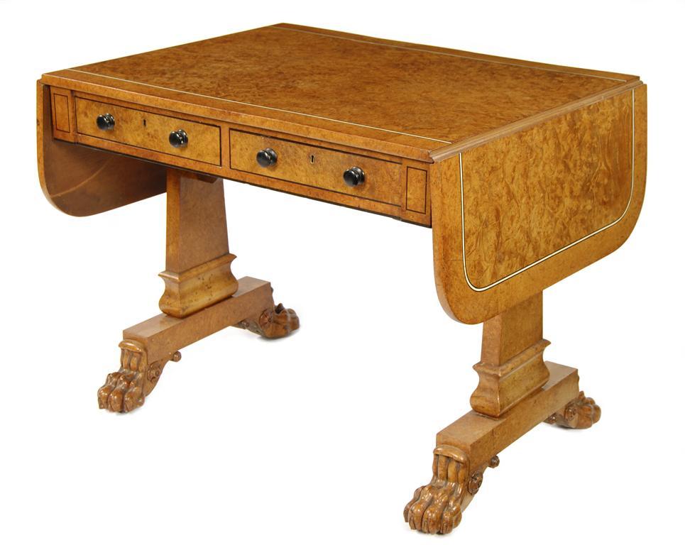 A Regency amboyna sofa table, with ebonised stringing, the crossbanded top inlaid ebony and ivory stringing above a pair of frieze drawers and false drawers to the reverse fitted ebonised knob handles, the twin flaps on shaped supports, the tapering end supports on ogee bases and rectangular platforms to carved paw feet with applied florets and with steel castors, 29in (73.5cm) h, 38in (96.5cm) w, 28in (71.5cm) d. Cedar lined drawers, crack running whole depth across top on left hand side, restoration.