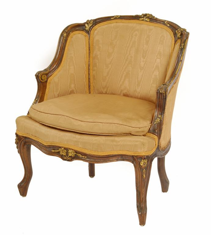 A carved walnut and parcel gilt low armchair, upholstered ochre watered silk.
