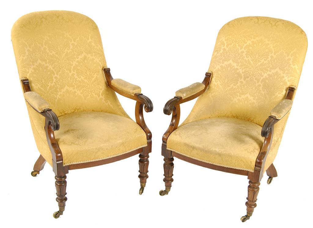 A pair of George IV rosewood open armchairs, upholstered in a yellow patterned damask, with padded arms having moulded scroll terminals with a bowfront seat on petal carved and turned legs to brass castors. (2) Both with restoration.