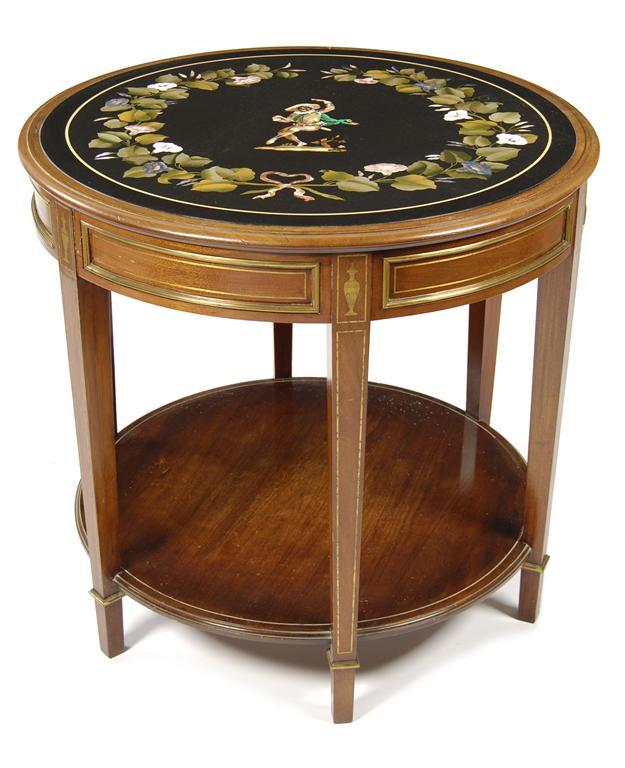 An Italian pietra dura table top, decorated with a floral and leaf wreath centred a dancing harlequin figure, inlaid with various hard stones including malachite, lapis lazuli, and agate, 2nd half 19th century, probably Florence, inset into a mahogany and brass mounted base, the moulded edge above a panelled frieze on square tapering legs headed by engraved urns, united by an undertier, the base late 19th century, possibly Baltic or Russian, 29.25in (74.3cm) h, 31.5in (80cm) dia. Losses to brass inlay.