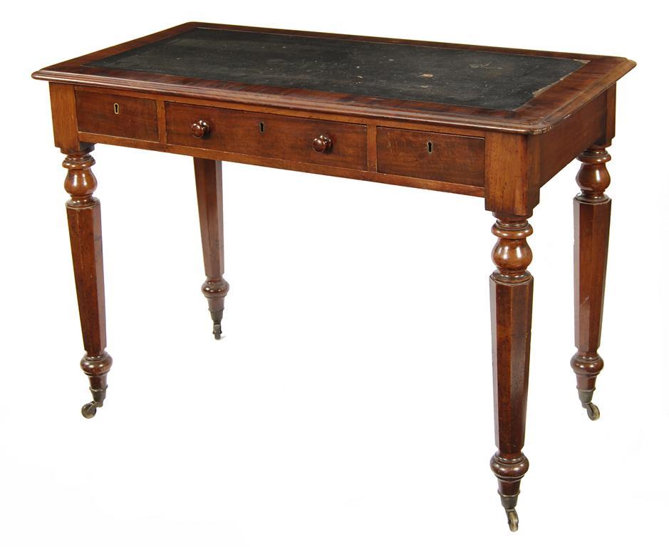 An early Victorian mahogany writing table, the rectangular moulded edge top inset blank cloth, above three frieze drawers, the centre fitted a hinged slope, on octagonal tapering legs to brass caps and castors, 32.5in (82.4cm) h, 41.75in (113.7cm) w, 23.75in (60.3cm) d.