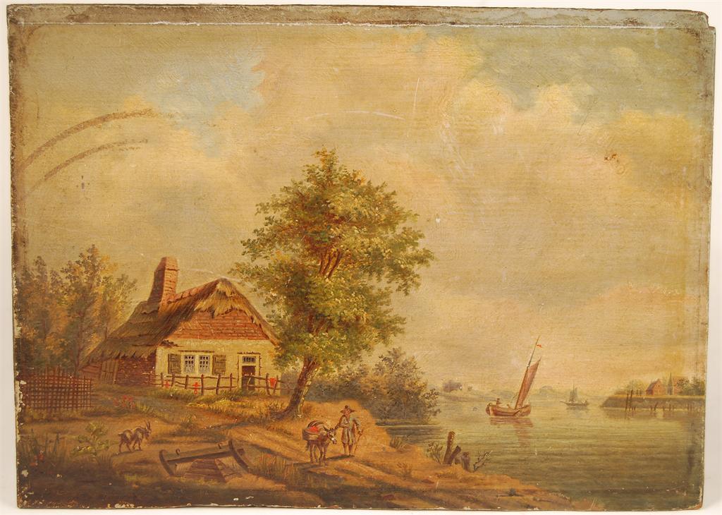 A 19th century oil on panel, figure on a river path with cottage behind and a castle in the distance, 8.5 x 11.5in (21.5 x 29.5cm).
