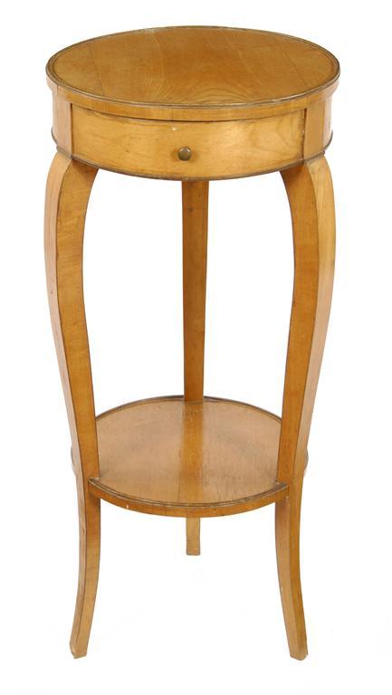 A late 19th century continental satinwood gueridon, having a frieze drawer on cabriole legs and an undertier, 30.75in (78cm) h, 13.75in (35cm) dia.