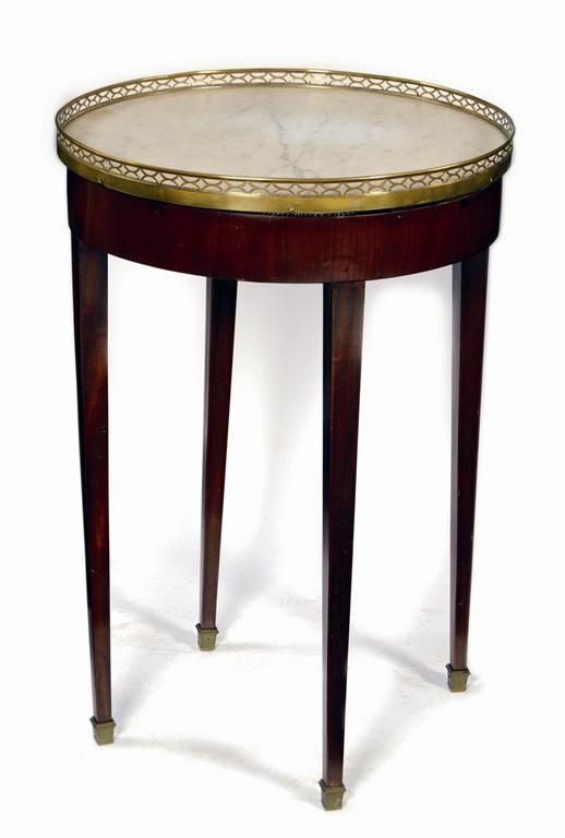 A mahogany gueridon, the carrara marble top with a pierced brass gallery on square tapering legs to brass caps, remains of trade label to underside 'B - EL & Cie', the top late 19th century the legs later, 28.5in (72.3cm) h, 19.5in (49.5cm) d.