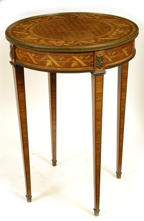A 19th century French kingwood, marquetry and parquetry occasional table, with gilt brass mounts, the circular top inlaid a band of ribbon tied flower and foliage above a single frieze drawer on square tapering legs, 29.765in (75.5cm) h, 21.25in (53.8cm) dia.