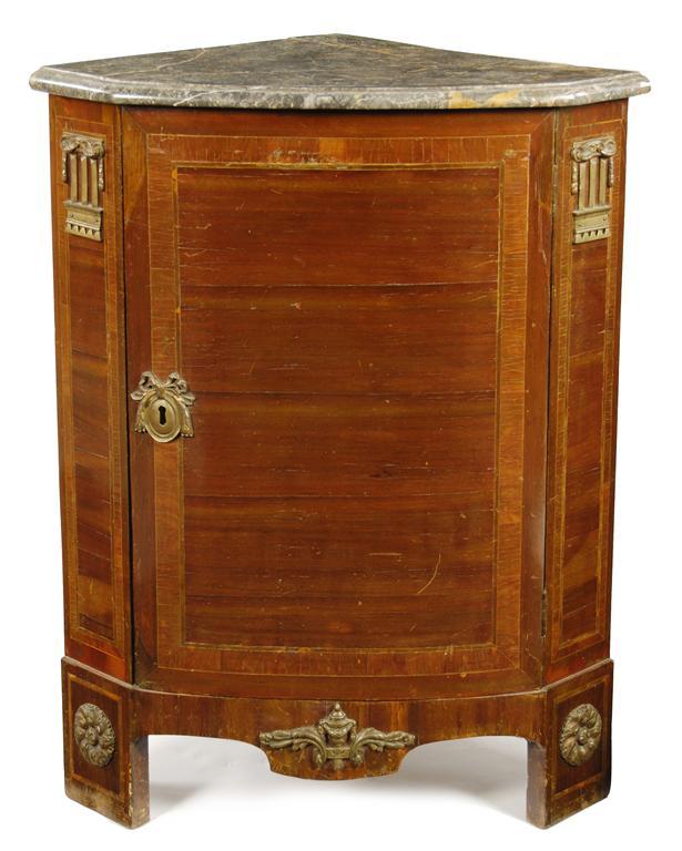 An early 19th century Dutch mahogany encoignure, with gilt metal mounts, the moulded edge marble top above a banded door enclosing a shelf, 34.75in (88.3cm) h, 27in (8.5cm) w, 18in (45.6cm) d. Marble damaged, old restorations and losses.