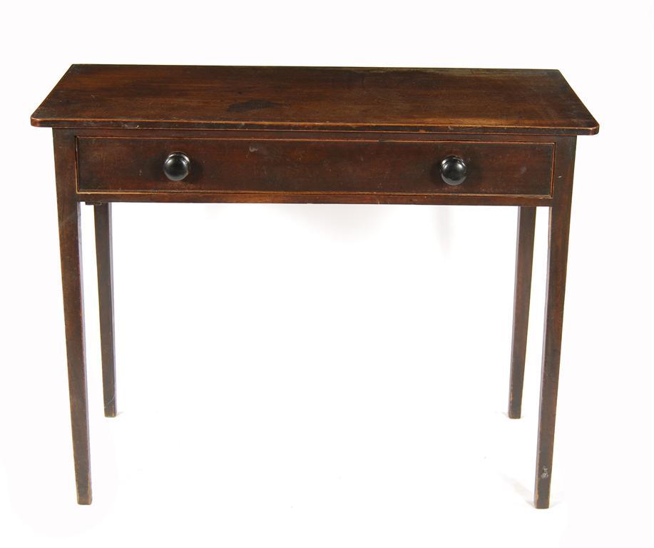 A late George III mahogany side table, with rounded front corners above a frieze drawer, fitted later handles on square tapering legs, two brackets remaining, 30in (76cm) h, 39in (99cm) w, 17.75in (45cm) d.