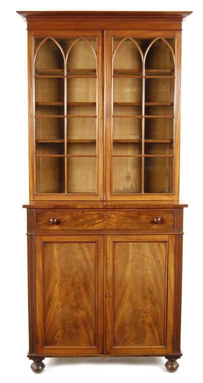 A Victorian mahogany bookcase cabinet, with a pair of lancet astragal glazed doors enclosing adjustable shelves, to a divided frieze drawer and a cupboard below enclosing two shelves, on turned bun feet, 86in (218.5cm) h, 41.25in (104.7cm) w, 18.5in (47cm) d. Restored.