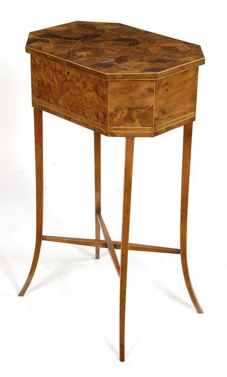 A Regency specimen wood and burr yew teapoy, the hinged top parquetry inlaid with various wood specimens above a divided interior, with four lidded compartments, on lid missing and two apertures for missing bowls, on square tapering swept legs united by a later 'X' stretcher, 30in (76.2cm) h, 17.25in (43.8cm) w, 12.75in (32.5cm) d.
