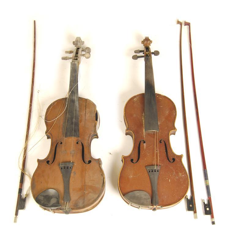 Two violins, one distressed and inscribed 'D. Nicolas', with two bows, one stamped 'Berini'. (4)