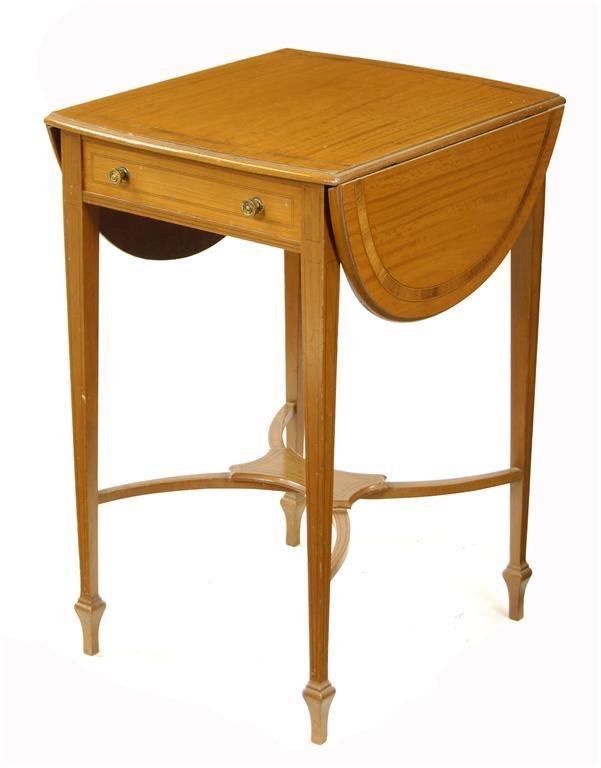 A late Victorian satinwood occasional table, the drop-leaf top banded in kingwood above a frieze drawer, on stretchered supports, 27.5in (69.6cm) h, 20 x 33.75in (51 x 85.5cm) open. Crack on top.