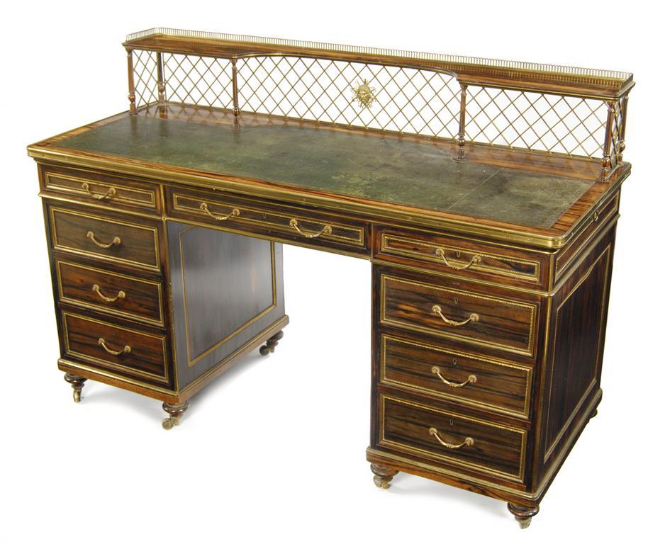 A mid Victorian calamander and gilt brass kneehole writing desk attributed to Wright and Mansfield, the raised back with a pierced 3/4 gallery on turned fluted column supports, with a trellis back to a green and gilt tooled leather surface, the panelled sides with pull-out slides, above three frieze drawers and three drawers to each pedestal all with foliate cast handles, on turned legs and brass castors, 36.5in (93cm) h, 53.75in (136.2cm) w, 22in (56cm) h. Crack to right side, some moulding lifting.¦Wright and Mansfield were one of the leading furniture makers, retailers and interior decorators between 1860 and 1886. They exhibited at the International Exhibition in 1862. They are famous for their Adam revival interiors at Guisachan, Inverness and the Louis XVI style rooms at Brook House, London. The attribution of Wright & Mansfield for this present lot is influenced by an almost identical desk in satinwood sold Christie's South Kensington, London 9th June 2004 for £15,535 (including buyer's premium). The centre drawer was stamped 'Wright and Mansfield, 104 New Bond Street'.¦
