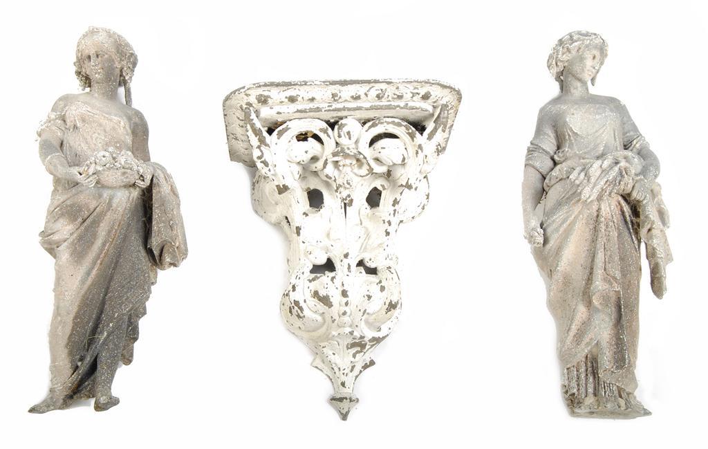 A pair of spelter figures, modelled as classical maidens representing Summer and Autumn, 16.25in (41cm) h, and a painted spelter bracket, 11.75in (30cm) h. (3)