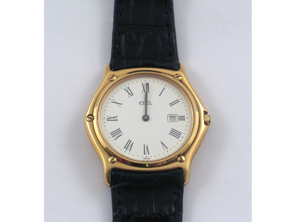 Ebel, gentleman's 18ct wristwatch, the circular white dial with roman numerals, baton hands and date apature, in a hexagonal brushed gold case, quartz movement, numbered on the reverse, original leather strap.