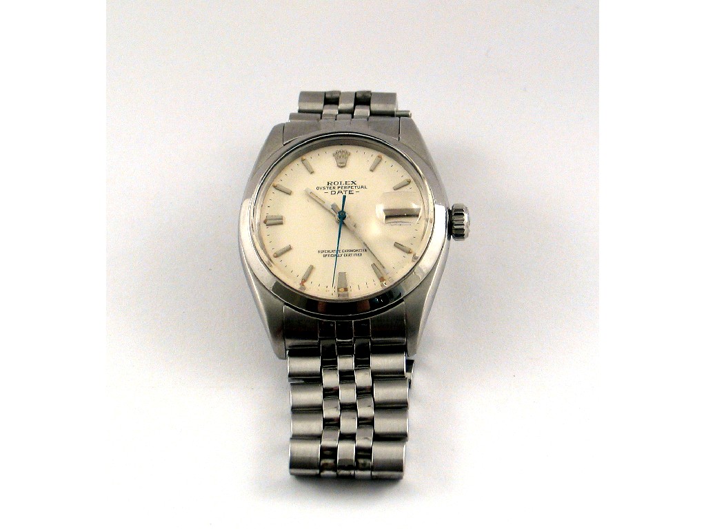 Rolex, oyster perpetual; a gentleman's stainless steel automatic calendar wrist watch , the white dial with baton numerals, centre sweep seconds and date apature, fitted jubilee bracelet with, deployment clasp.