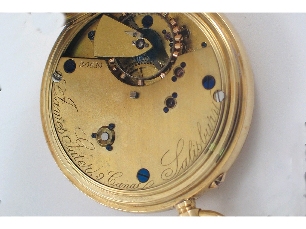 Salisbury interest: 18ct gold half hunting cased pocket watch, blue Roman numerals to the outer chapter ring, white enamel dial with subsidiary seconds dial, three quarter plate movement numbered 30619, signed James Gater, 9 Canal Street, Salisbury, the inner gold case engraved "Presented to W. M. Hammick by the South Wilts Constitutional Association, etc, February 26, 1902" engraved with crest and motto to the reverse.