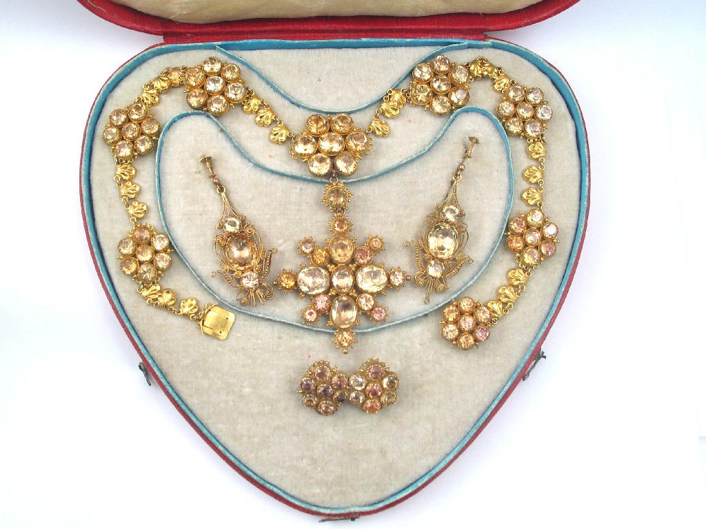 An early 19th century demi-parure, comprising necklace, earring and a brooch, all set with clusters of citrines in gold, the necklace with cruciform pendant, the earrings with cannetille decoration, fitted case.