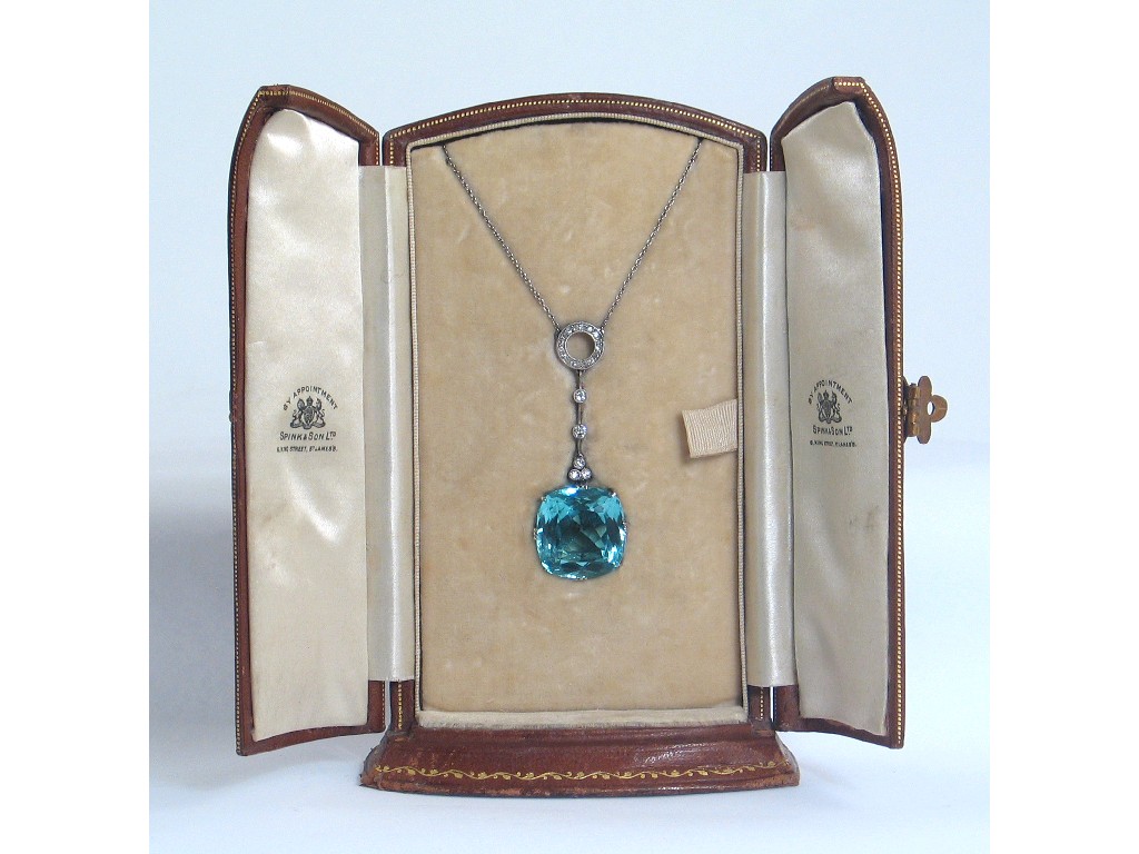 An Edwardian aquamarine and diamond pendant, the cushion shaped aquamarine suspends from a line of five diamonds and a diamond set circle, set in platinum with a fine link neck chain, fitted case by Spink.