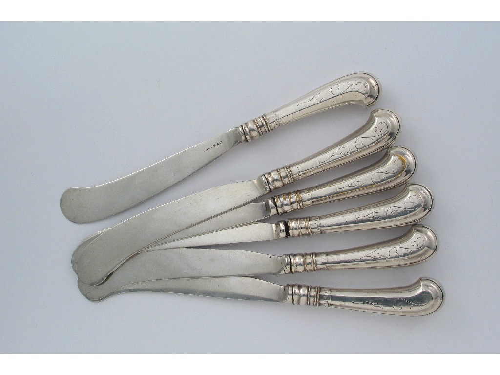 A set of six silvered brass side knives , pistol handled with close plated blades, stamped "GRATREX". (6)