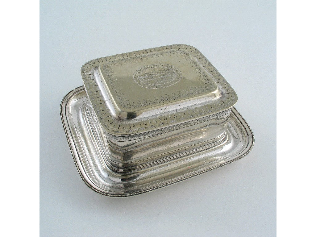 A Victorian sardine dish , with hinged cover depicting sardines and a fishing rod in an oval cartouche within an engraved border, on four bun feet, frosted glass liner, 7.4in (18.75cm).