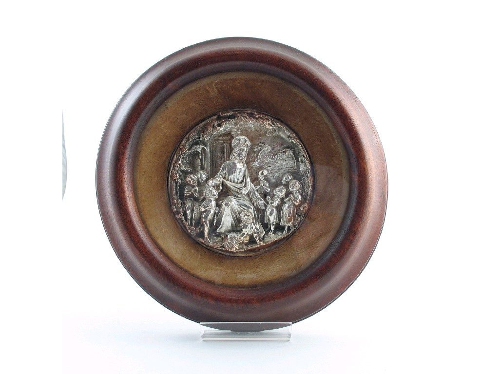 An electrotype copper plaque , "Suffer the Children to come unto me",in high relief, showing the seated figure of Christ, under a spreading tree, surrounded by children, 11.5cm, in glazed turned wood frame.