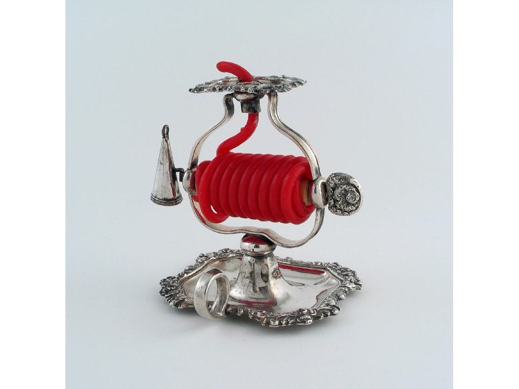 An old Sheffield plated wax jack , with foliate borders, c.1840, 4.5in (11.5cm) high.